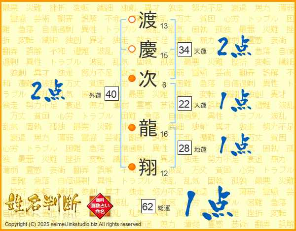 渡(13画)慶(15画)次(6画) 龍(16画)翔(12画)