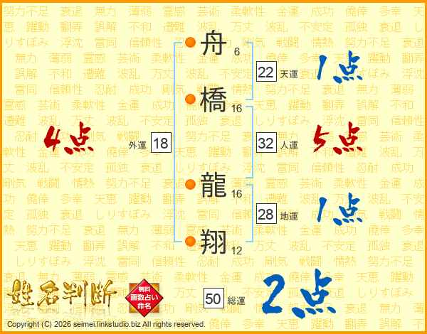 舟(6画)橋(16画) 龍(16画)翔(12画)