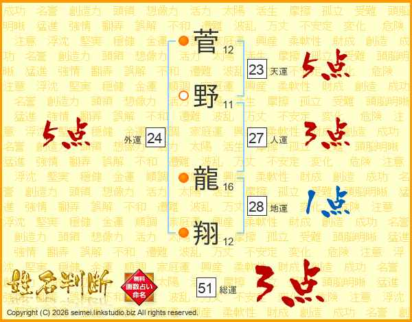 菅(12画)野(11画) 龍(16画)翔(12画)