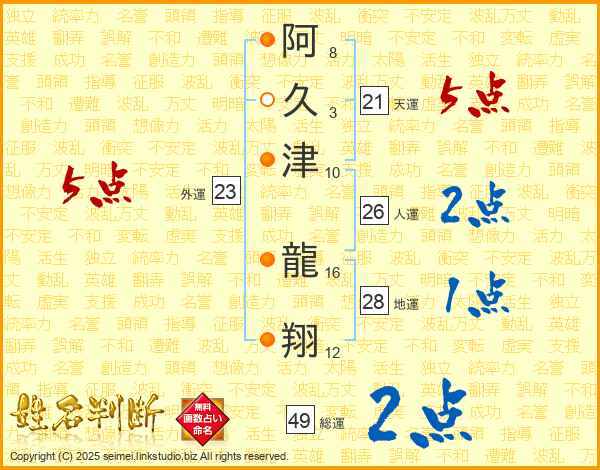 阿(8画)久(3画)津(10画) 龍(16画)翔(12画)