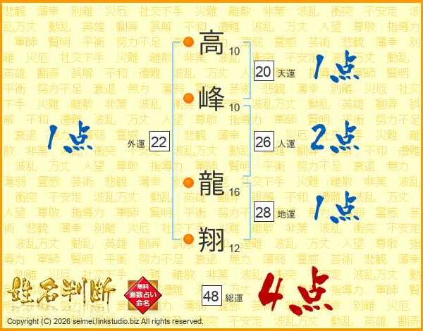 高(10画)峰(10画) 龍(16画)翔(12画)