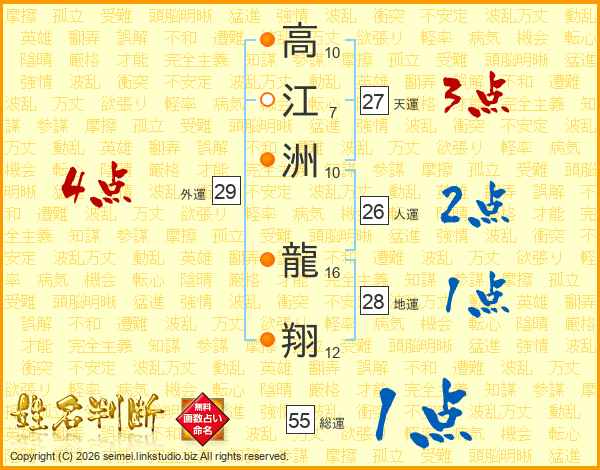 高(10画)江(7画)洲(10画) 龍(16画)翔(12画)