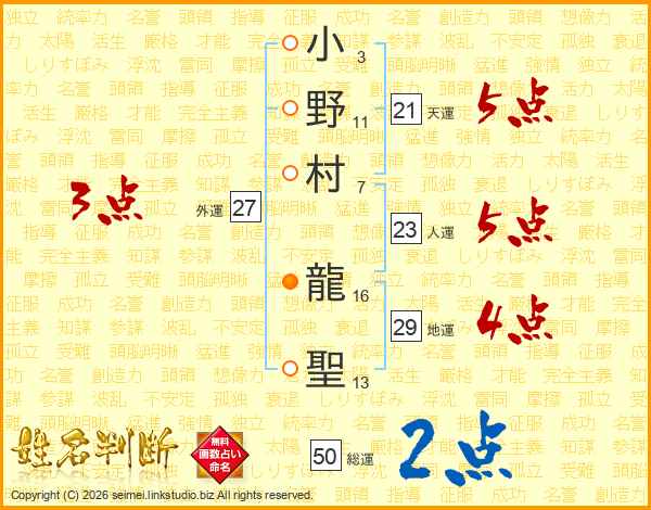 小(3画)野(11画)村(7画) 龍(16画)聖(13画)