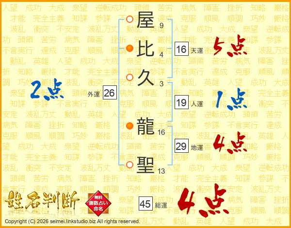 屋(9画)比(4画)久(3画) 龍(16画)聖(13画)