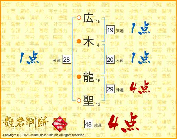 広(15画)木(4画) 龍(16画)聖(13画)