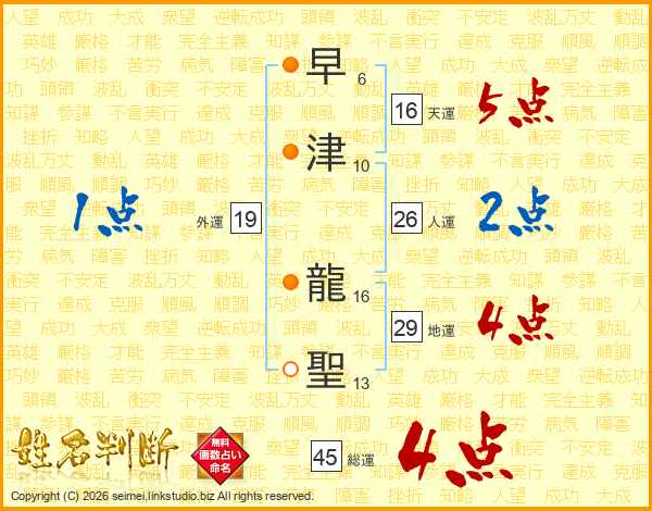 あなたの人生を表す1番重要な運勢です。生涯を通じて影響する総合運となり、主に50歳以降の晩年期に影響を及ぼします。苗字と名前の合計画数。