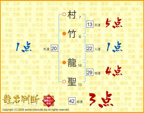 村竹龍聖さんの天運は13画の5点!