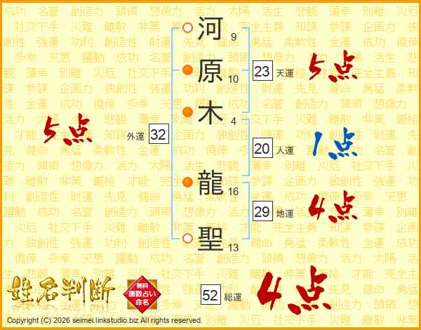 河原木龍聖さんの総運は52画の4点!