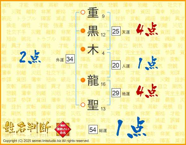 重(9画)黒(12画)木(4画) 龍(16画)聖(13画)