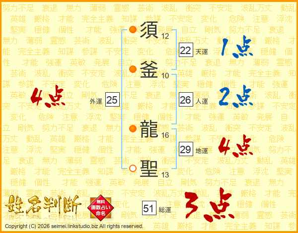 須(12画)釜(10画) 龍(16画)聖(13画)