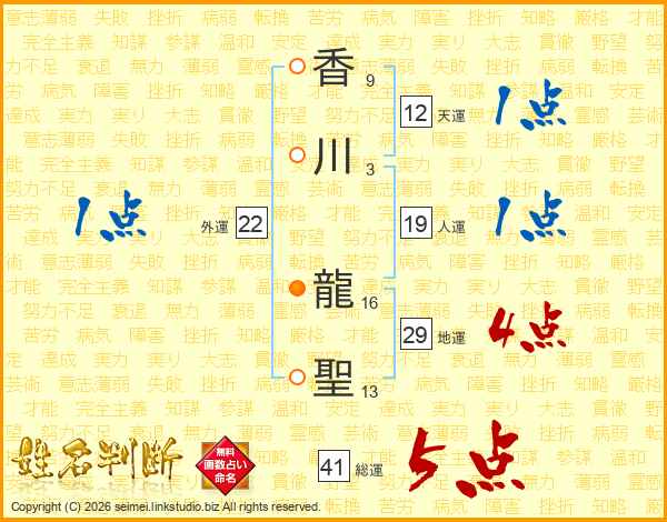 生活面を象徴する運勢です。外部から受ける影響力を表し、結婚運、家庭運や職場、環境への順応性を表します。総運から人運を引いた画数。姓や名が1文字の場合を除く。