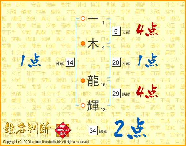 あなたの人生を表す1番重要な運勢です。生涯を通じて影響する総合運となり、主に50歳以降の晩年期に影響を及ぼします。苗字と名前の合計画数。