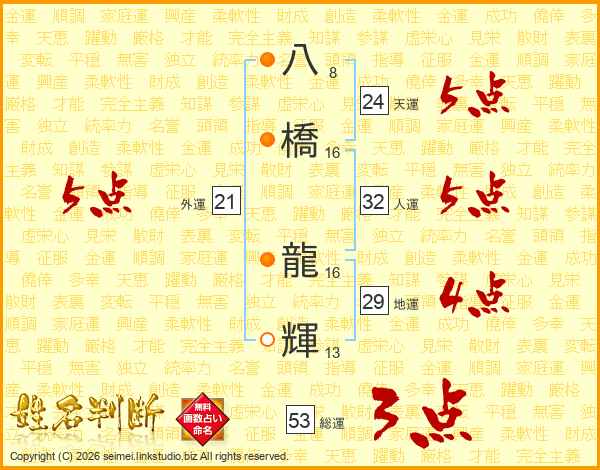 八(8画)橋(16画) 龍(16画)輝(13画)