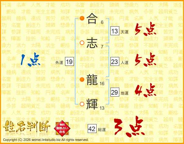 あなたの人生を表す1番重要な運勢です。生涯を通じて影響する総合運となり、主に50歳以降の晩年期に影響を及ぼします。苗字と名前の合計画数。