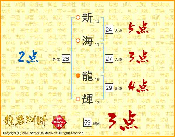 生活面を象徴する運勢です。外部から受ける影響力を表し、結婚運、家庭運や職場、環境への順応性を表します。総運から人運を引いた画数。姓や名が1文字の場合を除く。
