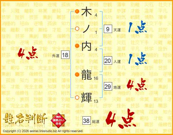 木(4画)ノ(1画)内(4画) 龍(16画)輝(13画)