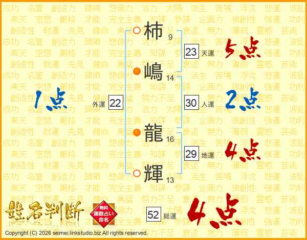 柿(9画)嶋(14画) 龍(16画)輝(13画)