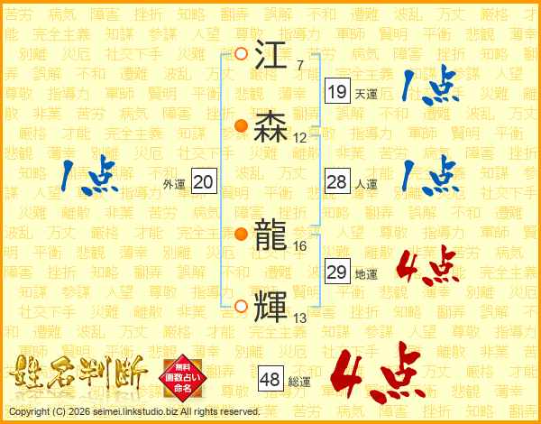 あなたの人生を表す1番重要な運勢です。生涯を通じて影響する総合運となり、主に50歳以降の晩年期に影響を及ぼします。苗字と名前の合計画数。