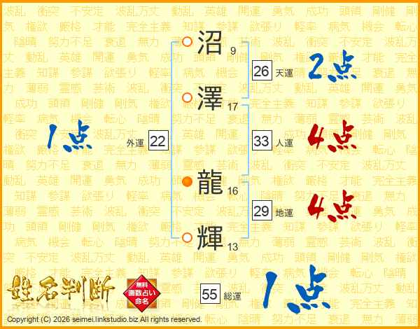 沼澤龍輝さんの天運は26画の2点!