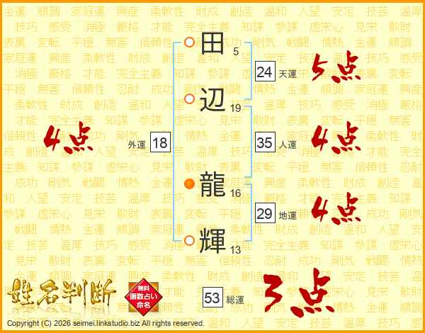 田(5画)辺(19画) 龍(16画)輝(13画)