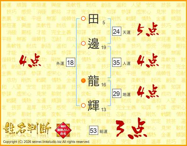 田(5画)邊(19画) 龍(16画)輝(13画)