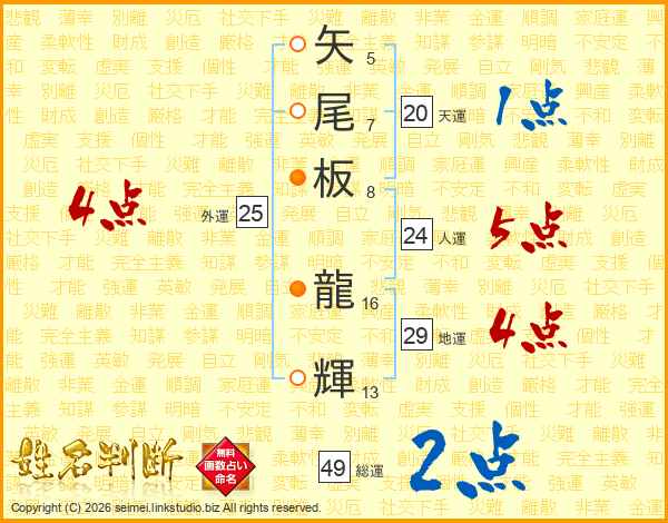 矢尾板龍輝さんの総運は49画の2点!