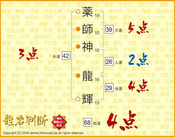 薬師神龍輝さんの総運は68画の4点!