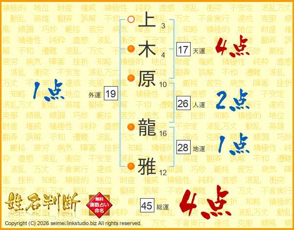 上(3画)木(4画)原(10画) 龍(16画)雅(12画)