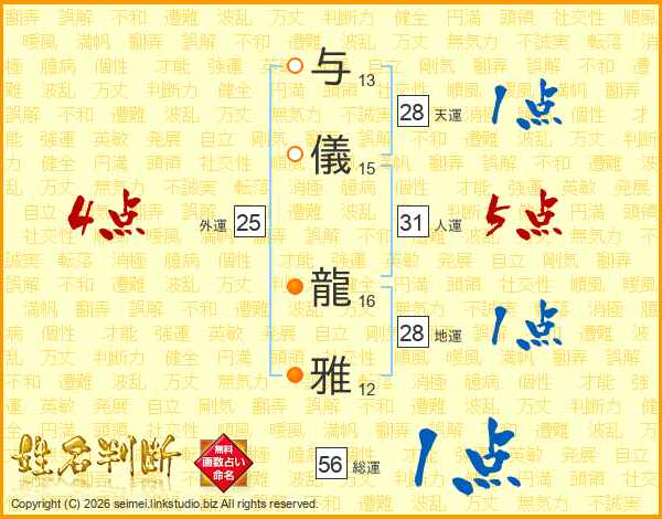 与儀龍雅さんの総運は56画の1点!