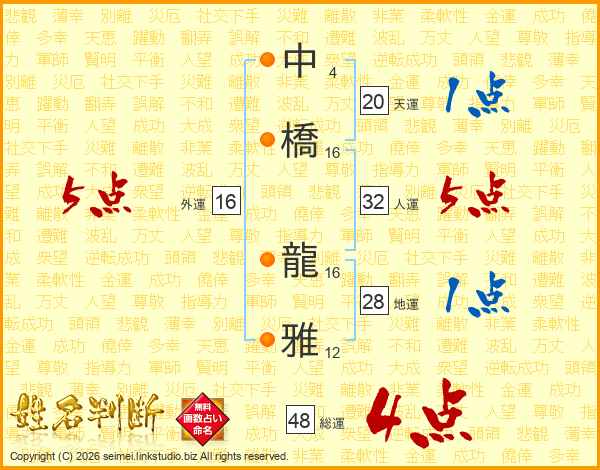 中(4画)橋(16画) 龍(16画)雅(12画)