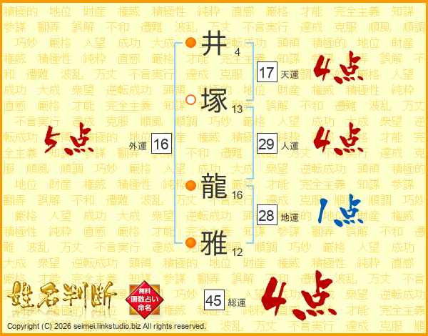 井(4画)塚(13画) 龍(16画)雅(12画)