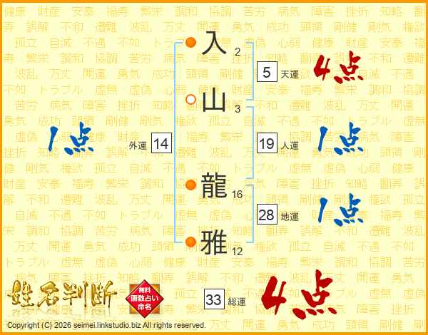 入山龍雅さんの総運は33画の4点!