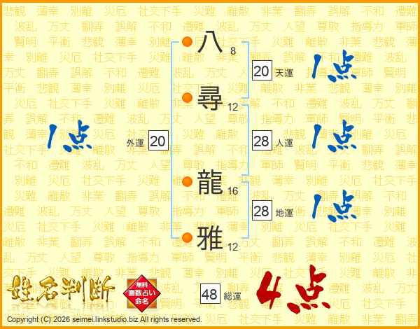 八(8画)尋(12画) 龍(16画)雅(12画)