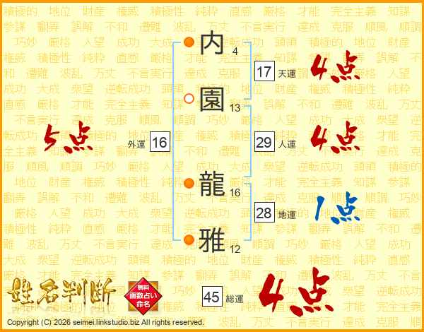 生活面を象徴する運勢です。外部から受ける影響力を表し、結婚運、家庭運や職場、環境への順応性を表します。総運から人運を引いた画数。姓や名が1文字の場合を除く。