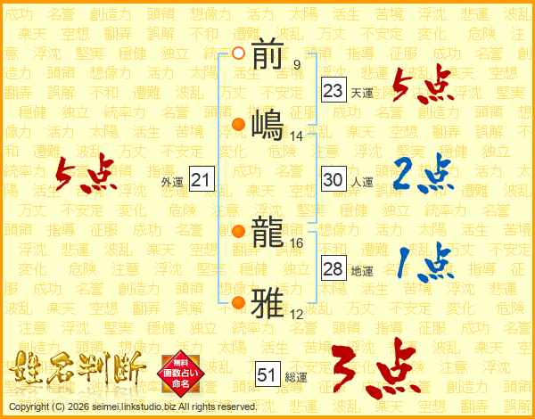 前(9画)嶋(14画) 龍(16画)雅(12画)