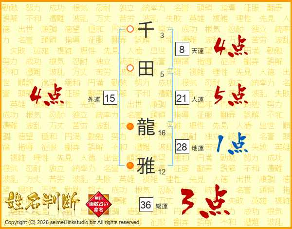 千田龍雅さんの総運は36画の3点!