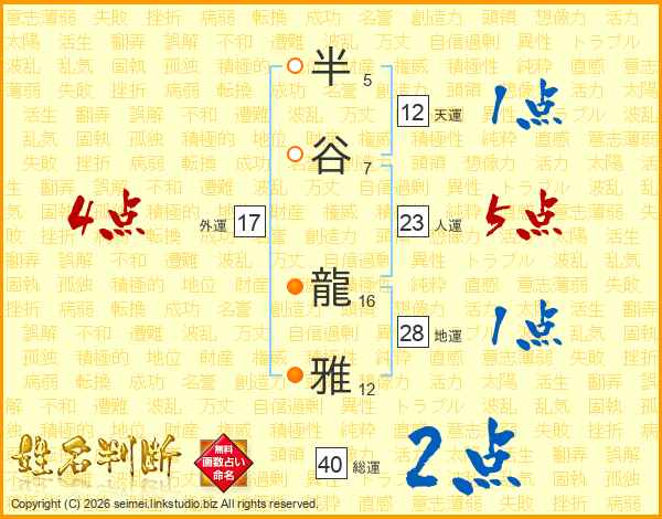 半(5画)谷(7画) 龍(16画)雅(12画)