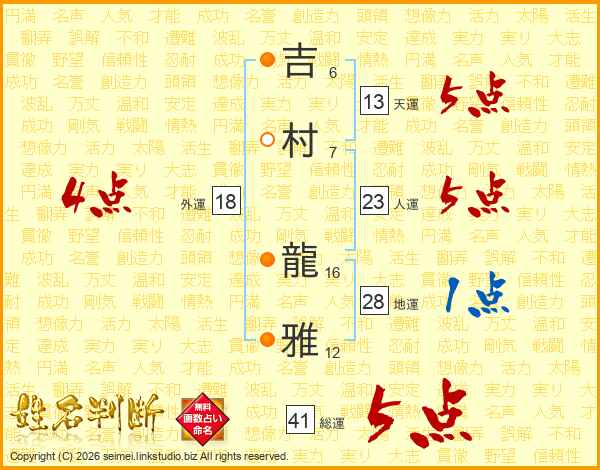 吉村龍雅さんの天運は13画の5点!