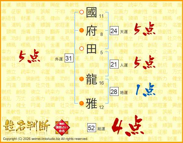 國(11画)府(8画)田(5画) 龍(16画)雅(12画)