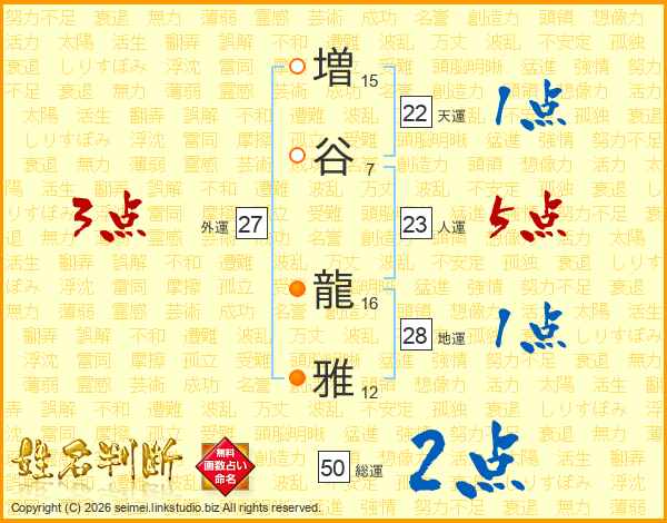 増(15画)谷(7画) 龍(16画)雅(12画)