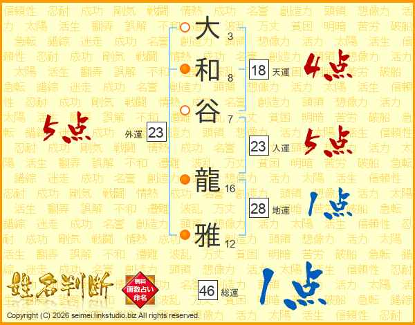 大(3画)和(8画)谷(7画) 龍(16画)雅(12画)
