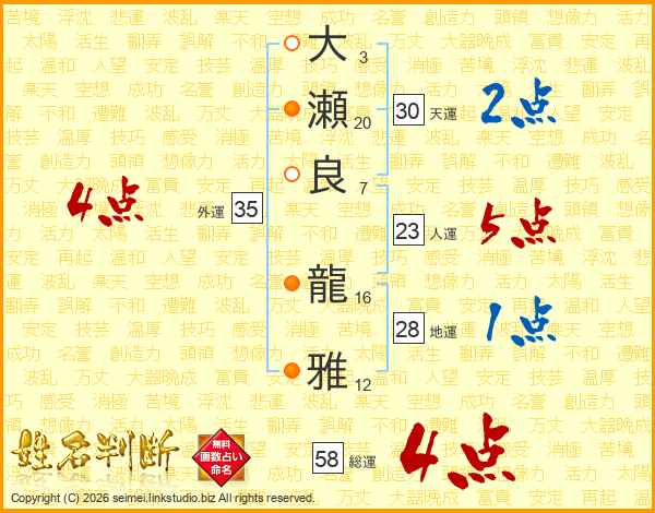 大瀬良龍雅さんの総運は58画の4点!