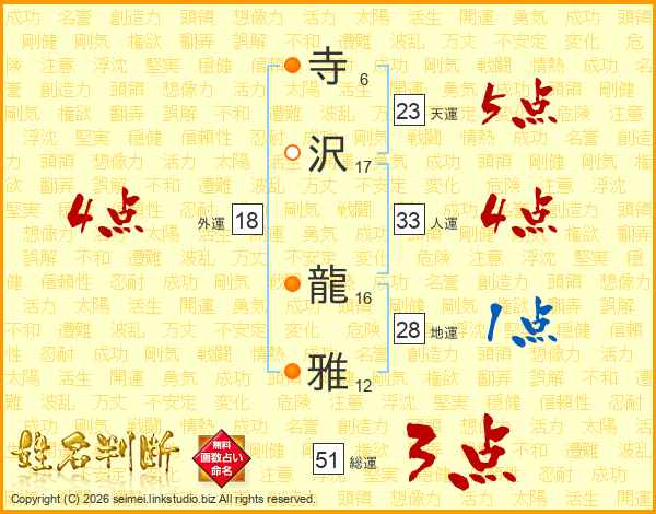 寺(6画)沢(17画) 龍(16画)雅(12画)