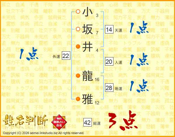 小(3画)坂(7画)井(4画) 龍(16画)雅(12画)