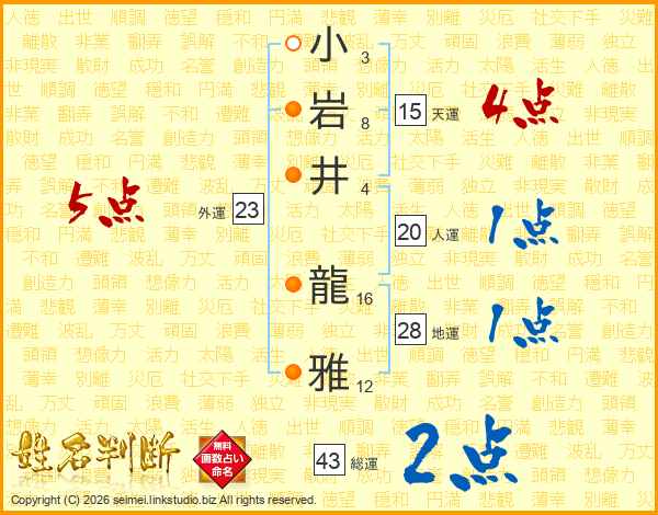 小(3画)岩(8画)井(4画) 龍(16画)雅(12画)