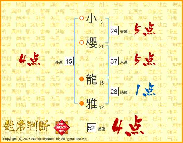 小櫻龍雅さんの総運は52画の4点!