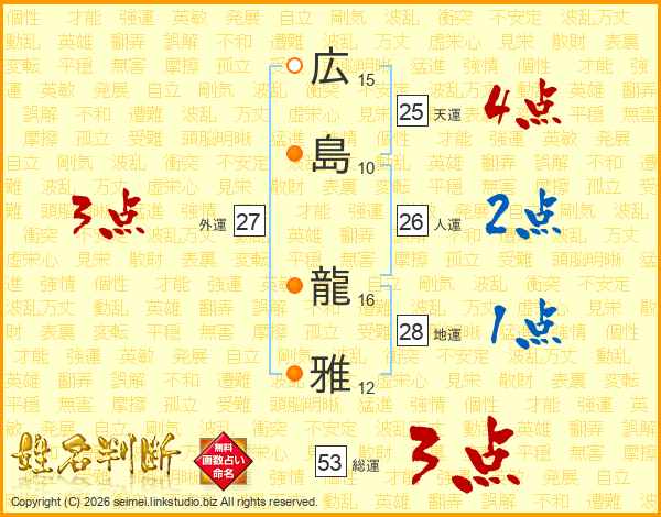 広島龍雅さんの人運は26画の2点!