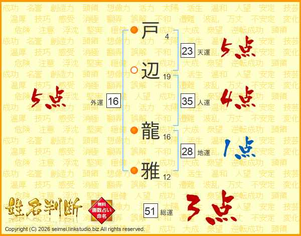 戸(4画)辺(19画) 龍(16画)雅(12画)