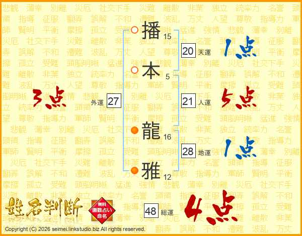 播本龍雅さんの総運は48画の4点!