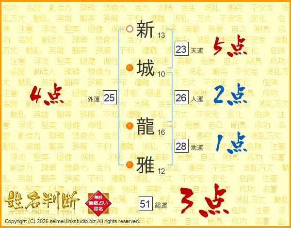 生活面を象徴する運勢です。外部から受ける影響力を表し、結婚運、家庭運や職場、環境への順応性を表します。総運から人運を引いた画数。姓や名が1文字の場合を除く。